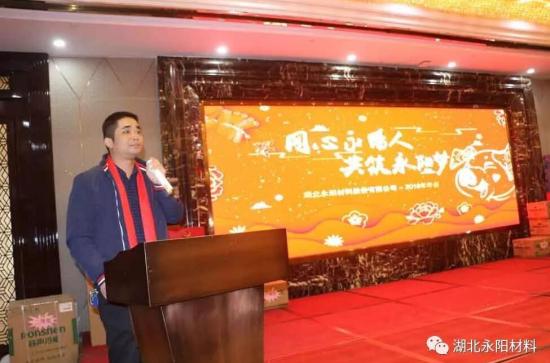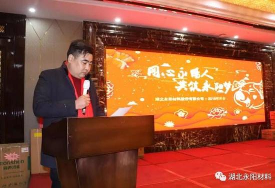 1月10日湖北永陽公司“同心永陽人 共筑永陽夢”2018年年會在中懋國際酒店順利舉辦,湖北省防水協會副會長黃曄、湖北永陽公司董事長劉詩銀、副董事長劉亞洲、總經理黃國鵬、駐外銷售分支機構負責人及公司全體員工均參加了此次年會。