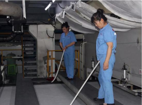 安徽生產基地生產車間內工人們正在緊張的工作中。據了解,安徽滁州近日最高氣溫已達到了38℃,工人們為了保質、保量、保時完成生產任務,盡管汗流浹背、酷熱難耐也未停下手中的工作。卷材車間工人戴長松說:“滁州這天太熱了,不大一會兒,全身就濕透了,工作服每天都是濕漉漉的,一天中最大的快樂就是喝水,但是機器在運轉,我們手中的活兒就不能停,認真完成好工作是最主要的。”據了解,安徽生產基地積極采取必要解暑食品供給,午飯準備了綠豆湯、冬瓜湯,還給工人們準備了雪糕、冷飲,確保大家在炎炎夏日有效的解暑降溫,高效生產。