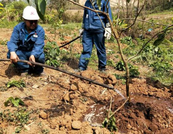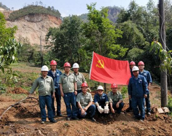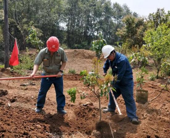 4月7日,盈江公司黨支部帶領節假日期間在崗堅守的中層以上管理人員在礦山荒坡上種植果樹。此次種植面積約610平方米,共種下25顆果樹。