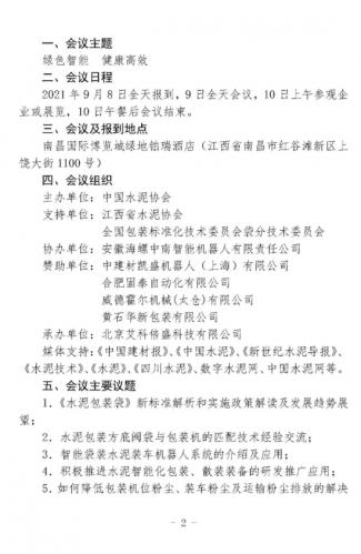 中國水泥協會決定于9月8日-10日在江西南昌召開“2021年全國水泥行業綠色智能化裝運系統技術交流會”,屆時將邀請相關專家學者,制袋、包裝、插包、裝車設備企業和水泥生產企業的代表共同就水泥行業綠色智能裝運技術及應用問題進行全面探討。現將會議有關事項通知如下: