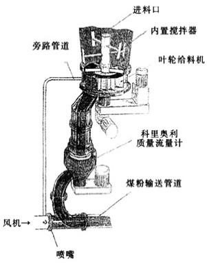 煤粉由流量計(jì)流出后,經(jīng)過(guò)一段彎管進(jìn)入輸煤管道,由于噴嘴兩邊的正負(fù)壓差(噴嘴位置需在安裝調(diào)試時(shí)確定),這樣煤粉可以較容易地被輸送。同時(shí),從噴嘴靠風(fēng)機(jī)端引出一條正壓管線(xiàn),對(duì)葉輪給料機(jī)內(nèi)施加一個(gè)小的氣壓(葉輪給料機(jī)與流量計(jì)出料管間壓差約5000Pa),使下料更為順暢,凈風(fēng)的風(fēng)壓僅需50000Pa即可將煤粉送出,不需設(shè)螺旋泵。葉輪與外殼間隙僅0.2mm,被煤粉填充,可以保持葉輪給料機(jī)上下的壓差,保證下料流暢及穩(wěn)定。該喂煤系統(tǒng)的葉輪給料機(jī)與煤粉倉(cāng)出料管之間用法蘭聯(lián)接,流量計(jì)與葉輪給料機(jī)出料管之間、流量計(jì)出料管與煤粉輸送管線(xiàn)之間也用法蘭聯(lián)接,無(wú)需其它安裝支架,安裝高度低,安裝和拆卸維修方便;密封性能好,保持煤粉倉(cāng)下料的環(huán)境干凈。