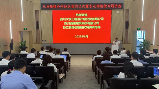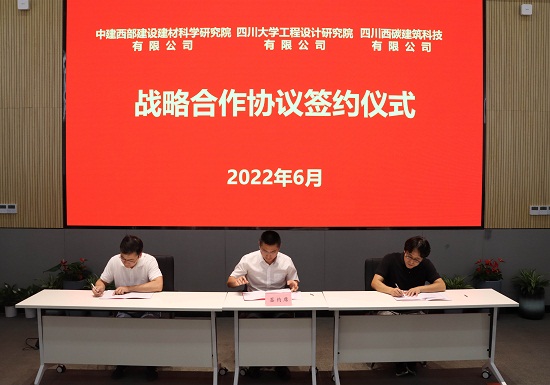 全景 四川大學建筑與環境學院副院長、教授、博士生導師 李沄璋 簽署協議現場 簽署協議現場 四川西碳建筑科技有限公司董事長 嚴濤 中建西部建設建材科學研究院黨總支書記、院長 高育欣