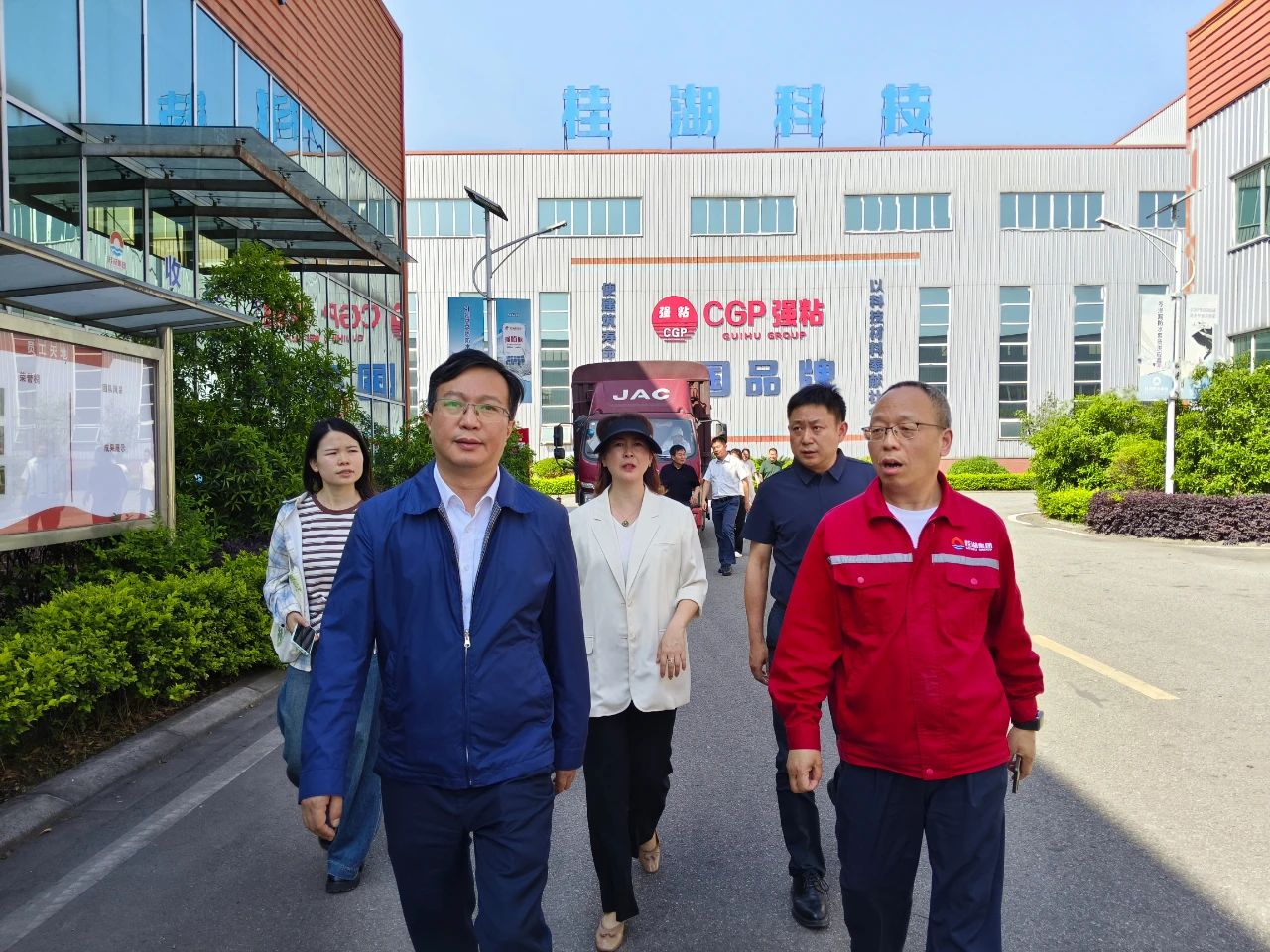 王靈陪同茍建汶一行首先后參觀了強粘會所中心、科研中心、生產車間以及庫房。詳細介紹了企業(yè)差異化產品,生產流程以及在節(jié)能減排、資源循環(huán)利用等方面所采取的措施。