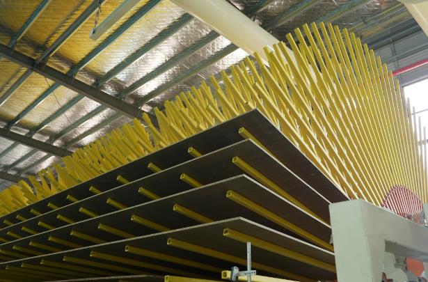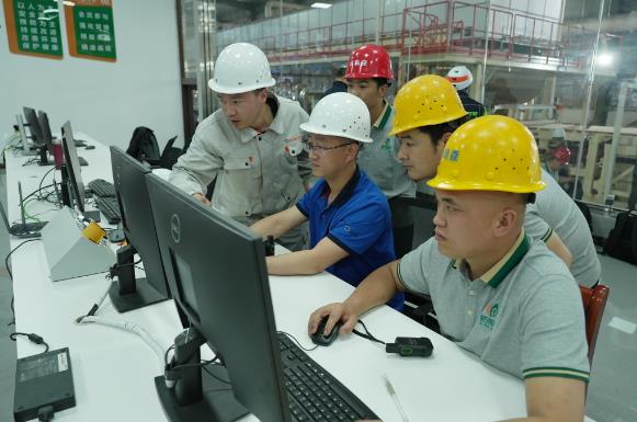 儀式現場 眾人齊力迎接首板下線 刨花板生產線局部 智控室內忙碌的工作人員 多功能智控室一角