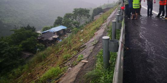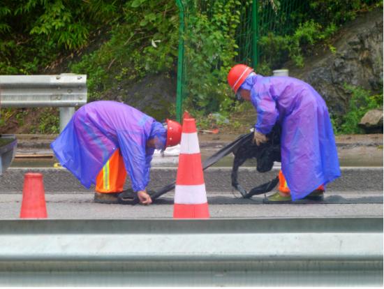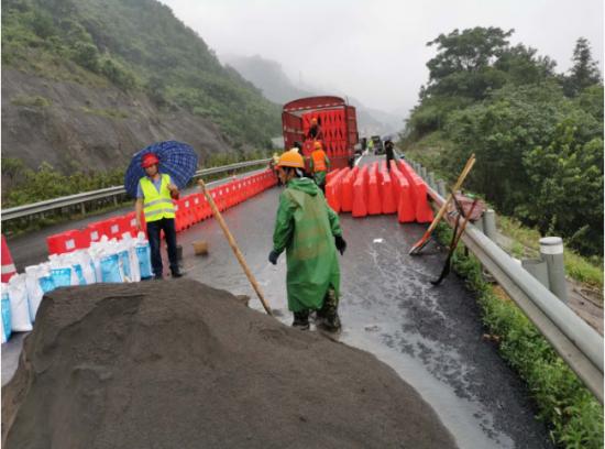 磅礴大雨中,高速集團(tuán)南方公司的施工設(shè)備和人員立即進(jìn)場(chǎng),在原出現(xiàn)沉降和開(kāi)裂的路面上重新攤鋪瀝青混凝土,路橋公司的員工則冒雨在有裂縫的水溝、邊坡等地方灌注水泥混凝土,阻斷雨水浸入填方體,為下步施工創(chuàng)造條件,爭(zhēng)取時(shí)間。